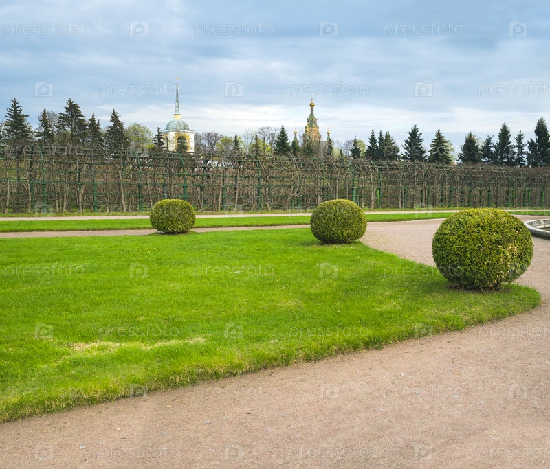 Вид из Верхнего парка Петродворца (Петергоф, Санкт-Петербург) в начале лета на Православный Собор Петра и Павла и Крестовоздвиженскую церковь