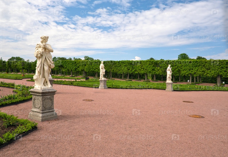 Петродворец (Петергоф, Санкт-Петербург, Россия). Летний вид Большого дворца и скульптуры из Верхнего парка