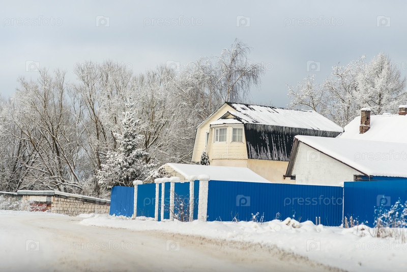Зимний пейзаж - вид на деревенскую дорогу и дома в солнечный день
