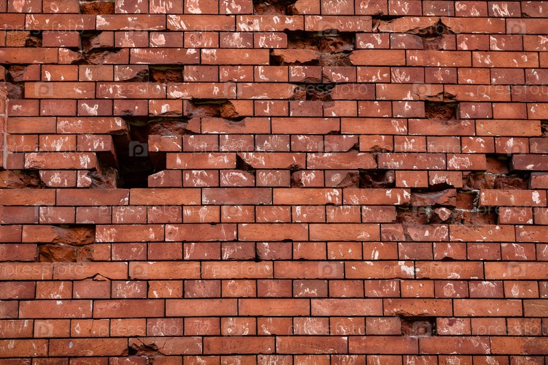 Беларусь, Брест, август 2023 г.: Кирпичная стена со следами обстрела в Брестской крепости