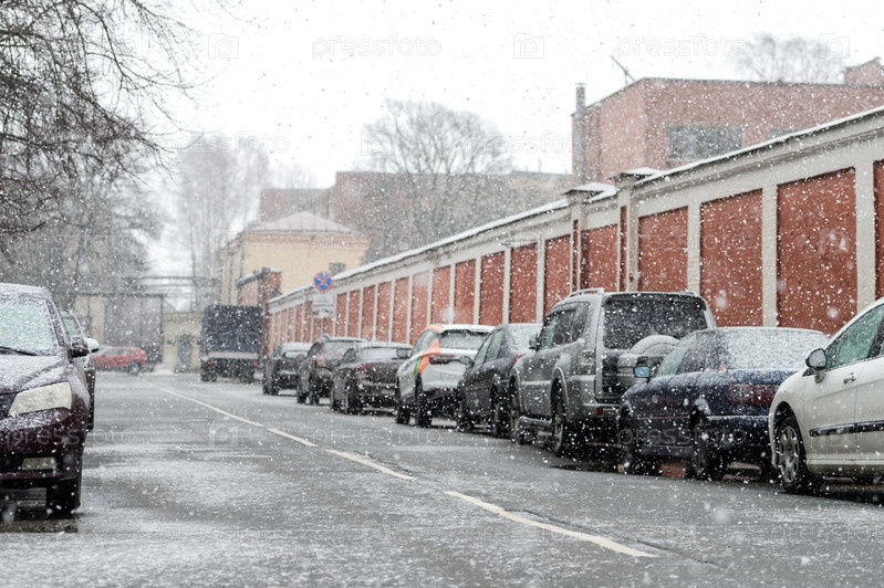 Автомобили, припаркованные на обочине дороги в городе во время снегопада зимой