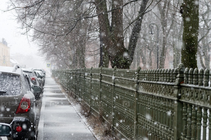 Автомобили, припаркованные на обочине дороги в городе во время снегопада зимой