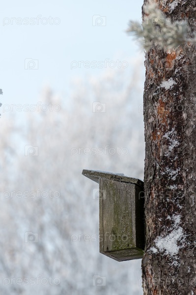 Скворечник на стволе дерева в зимнем парке в морозную погоду