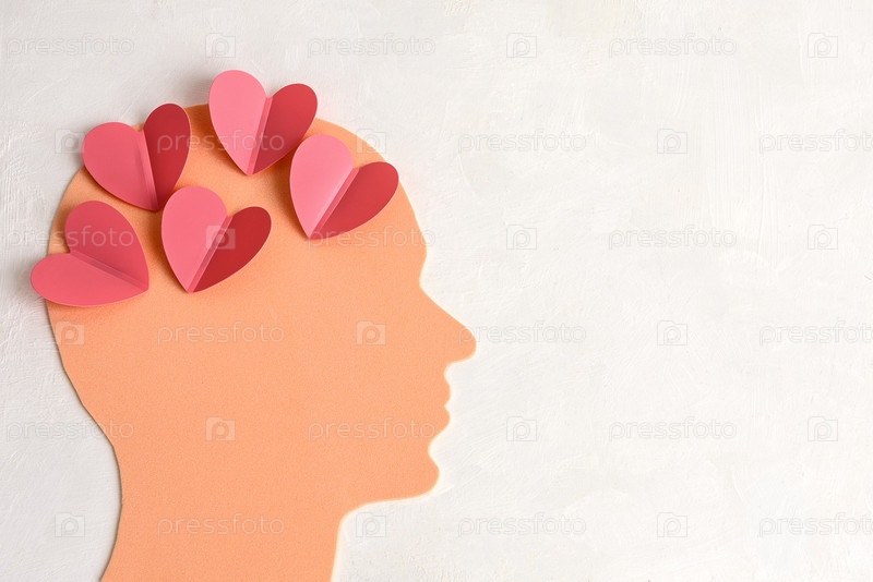 Человеческая голова, заполненная сердцами на светлом фоне. Концепция влюбленного мужчины