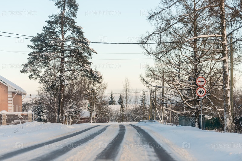 Россия, Санкт-Петербург, декабрь 2024 г.: Заснеженная дорога через деревню в солнечный день