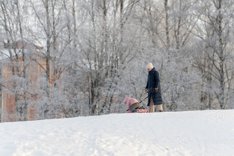 Мать и ребенок катаются с горки в зимнем парке. Россия, Гатчина, январь 2024 года