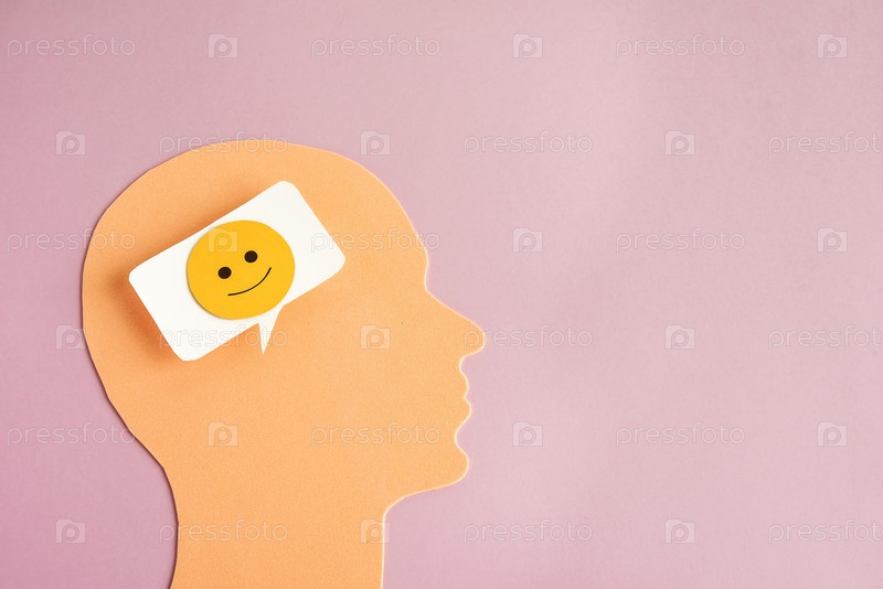 Голова со счастливыми мыслями. Символ человеческой головы и пузыря с позитивным лицом внутри