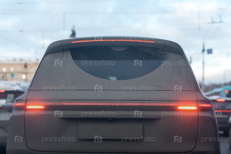 Грязный вид сзади автомобиля зимой в городе
