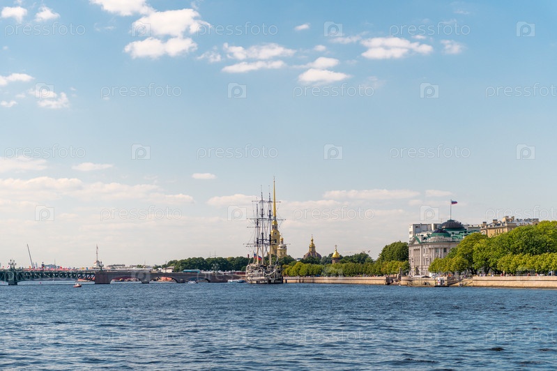 Россия, Санкт-Петербург, 24.07.2024: Вид с Невы в Санкт-Петербурге на берег и мост