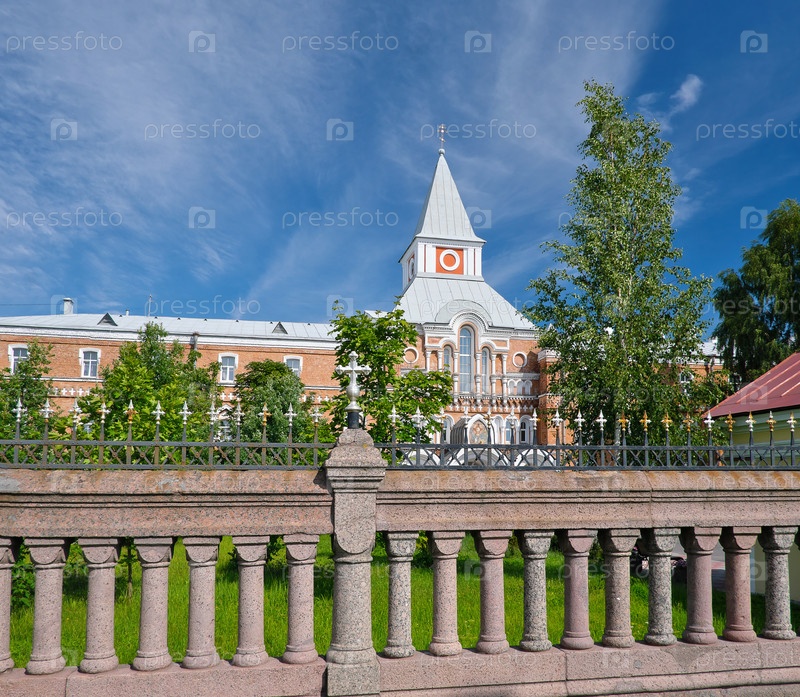 Санкт-Петербург, Троице-Сергиева Приморская пустынь. Братский корпус с Надвратной церковью св. Саввы Стратилата на фоне синего неба. Архитектор Горностаев