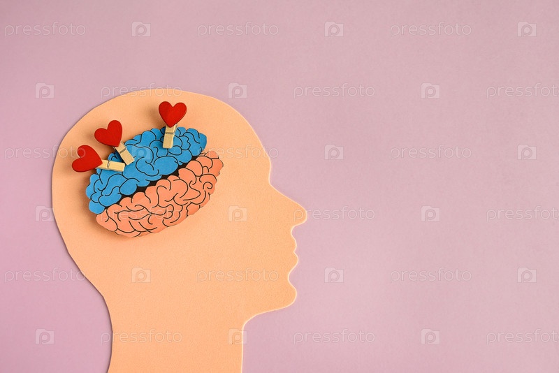 Символ человеческой головы и мозга, заполненного сердцами. Концепция счастливого или любящего человека. Психическое здоровье и профилактика инсульта