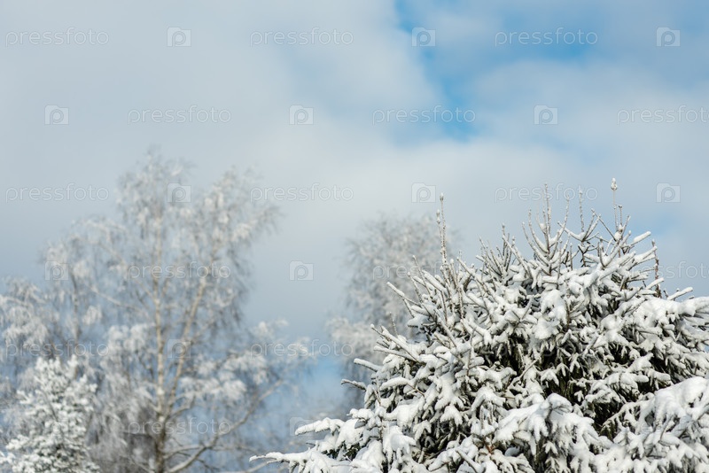 Заснеженная сосна на фоне облачного неба