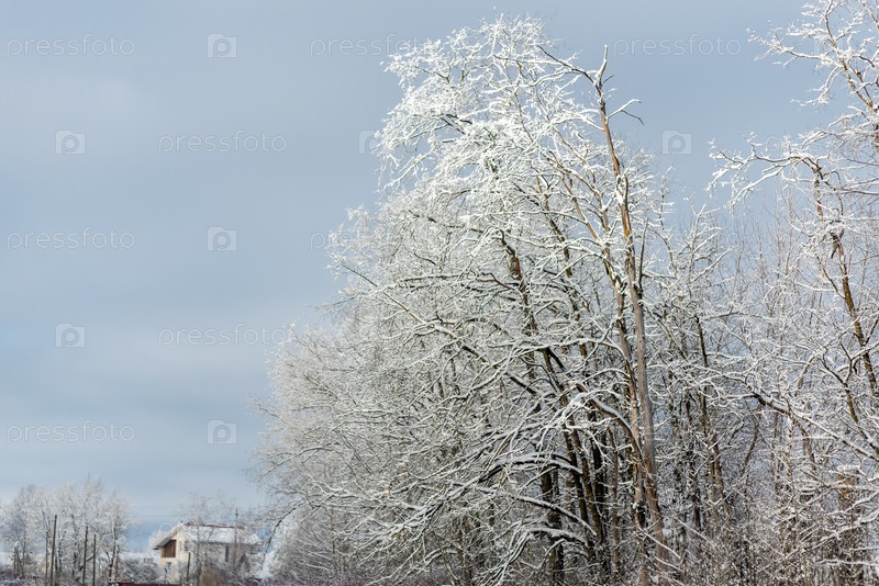 Дерево, покрытое снегом, на фоне голубого неба
