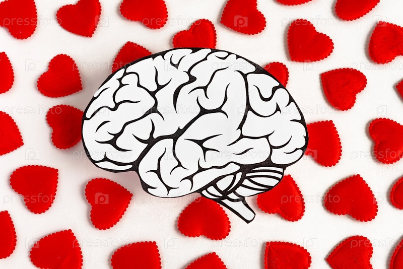 Человеческий мозг на фоне множества красных сердец. Здоровье, любовь и медицина