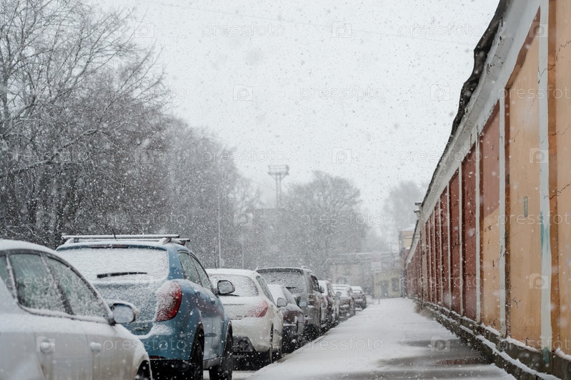 Автомобили, припаркованные на обочине дороги в городе во время снегопада зимой