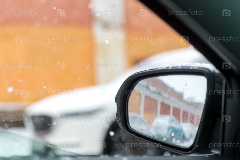 Отражения припаркованных автомобилей в городе зимой в боковом зеркале автомобиля