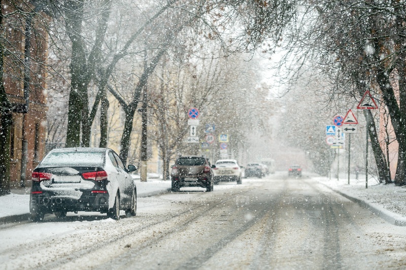 Автомобили, припаркованные на обочине дороги в городе во время снегопада зимой