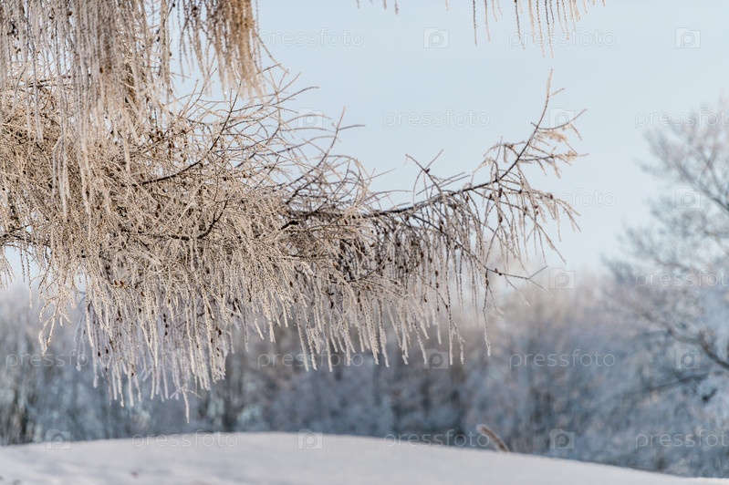 Снег на ветвях деревьев в зимнем парке. Морозная погода