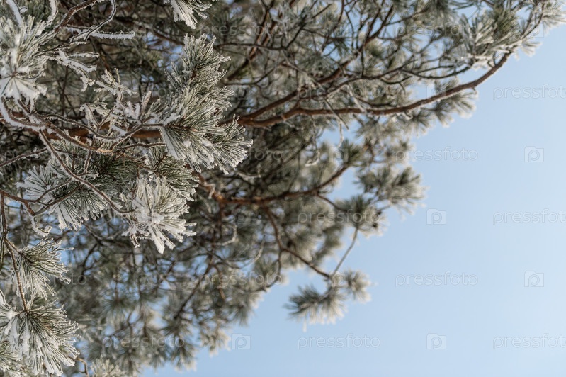 Снег на ветвях деревьев в зимнем парке. Морозная погода