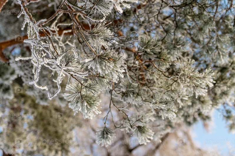 Снег на ветвях деревьев в зимнем парке. Морозная погода
