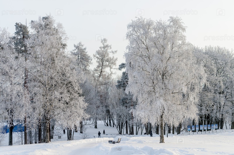 Зимний парк в солнечный день. Красивый зимний пейзаж