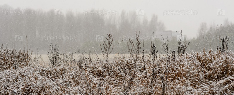 Первые заморозки снега на сухой траве