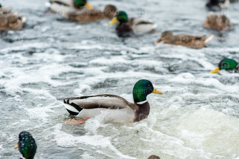 Утки в озере зимой в холодной воде