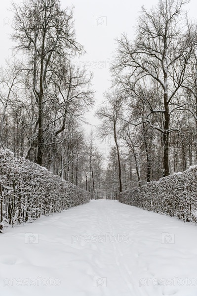 Аллея и деревья в снегу в зимнем парке