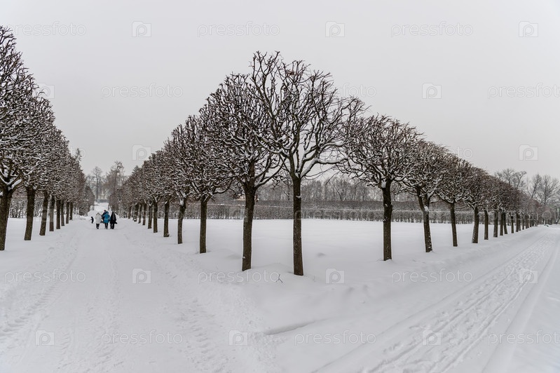 Аллея и деревья в снегу в зимнем парке