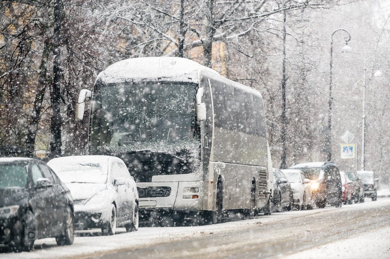 Автомобили, припаркованные на обочине дороги в городе во время снегопада зимой