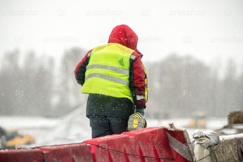 Россия, Санкт-Петербург, 3 марта 2025 г.: Дорожные рабочие в желтых куртках работают на строительстве дороги и моста зимой