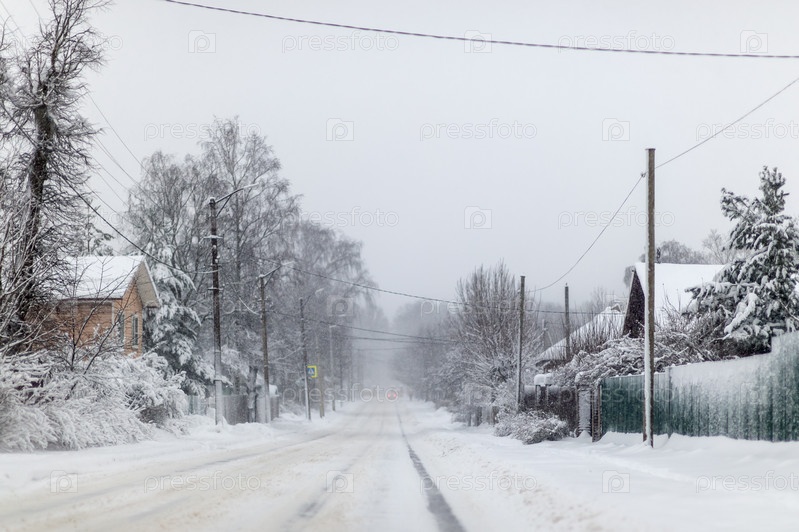 Россия, Гатчина, январь 2025 г.: зимняя улица небольшого города во время снегопада