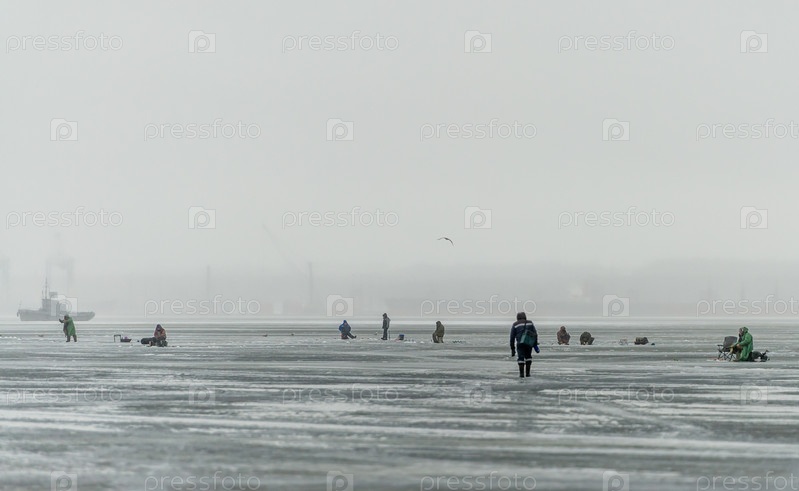 Россия, Санкт-Петербург, 3 марта 2025 г.: Рыбаки на зимней подледной рыбалке в холодный день. Опасная подледная рыбалка
