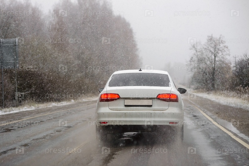 Автомобиль на дороге в первые дни зимы и мороз вид сзади