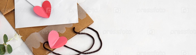 Фон ко Дню святого Валентина. Розовые сердечки и цветы на светлом фоне. Плоский макет и место для копирования