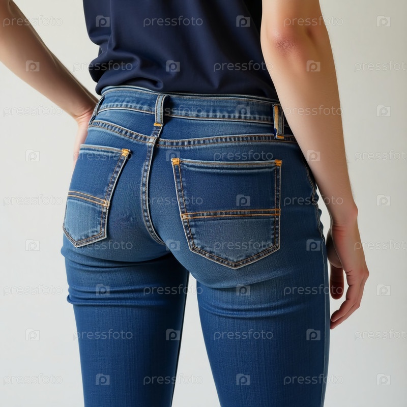 В хорошо освещенном современном пространстве женщина позирует в облегающих джинсах синего денима, подчеркивая уникальную строчку и классический дизайн с пятью карманами. Основное внимание уделяется заявлению о моде