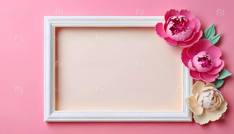 Нежные пионы розового, белого и бежевого цветов украшают пространство в белой рамке на нежно-розовом фоне, создавая умиротворяющую атмосферу для творчества