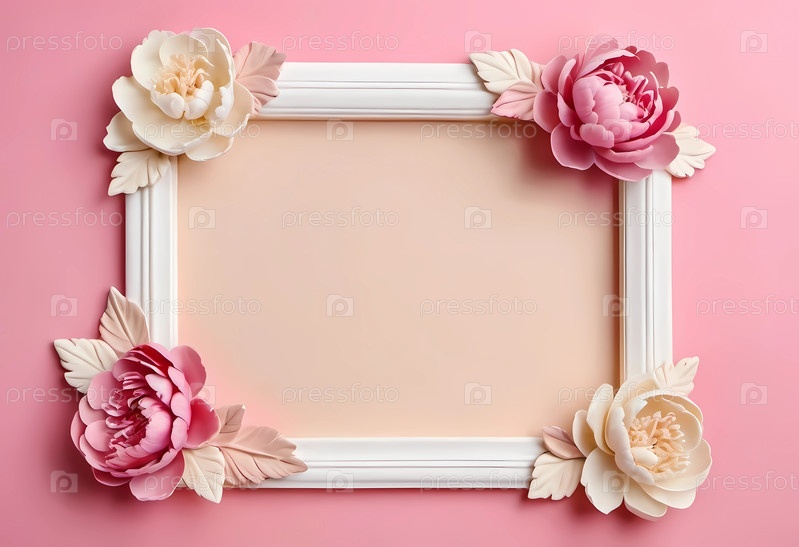 Нежные пионы розовых и кремовых оттенков украшают классическую рамку на нежно-розовом и бежевом фоне, создавая уютную атмосферу, идеально подходящую для демонстрации произведений искусства и воспоминаний