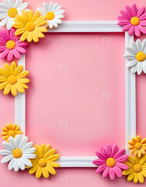 Яркие ромашки желтого, белого и розового цветов создают привлекательную рамку на мягком пастельном фоне, демонстрируя пустое пространство, готовое к индивидуальному подходу или креативному дизайну