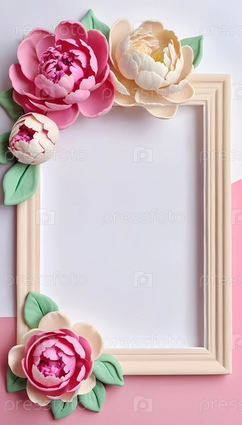 Мягкие розовые и бежевые оттенки создают нежный фон, а пионы элегантно украшают раму. Это пустое пространство приглашает к художественному самовыражению и личным штрихам, пробуждая вдохновение