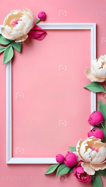 Нежная композиция демонстрирует яркие пионы в оттенках розового и бежевого в белой рамке. Мягкий фон усиливает очарование цветов, создавая уютное пространство