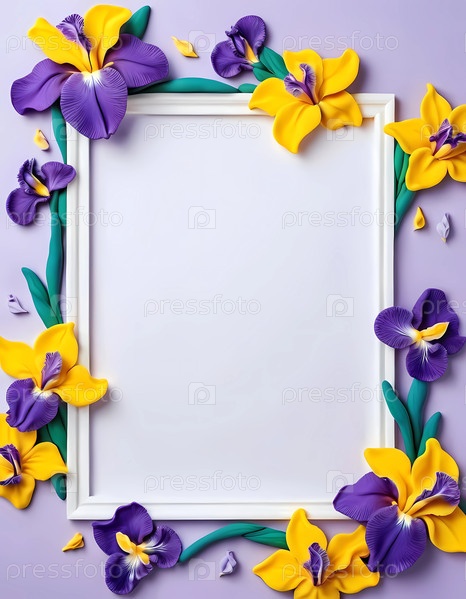 Красочные цветы ириса белого, желтого и фиолетового цветов элегантно обрамляют открытое пространство, приглашая к художественному самовыражению и вдохновению в восхитительной обстановке