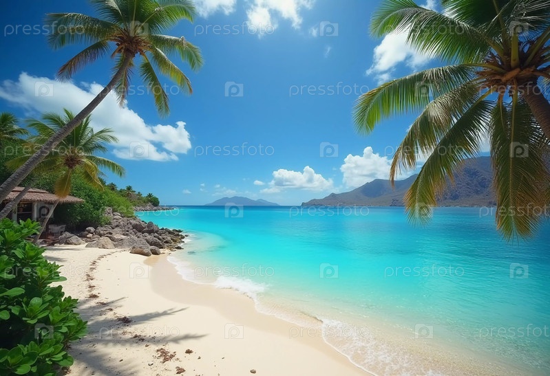 Волны нежно омывают мягкий песок, а яркие пальмы покачиваются под теплым солнцем на пляже Палм-Бич, создавая безмятежный отдых в прекрасном карибском раю. Ясное небо дополняет картину