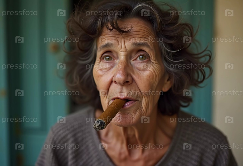В самом сердце Гаваны пожилая кубинская женщина с выразительными глазами и вьющимися волосами наслаждается моментом релаксации с сигарой. Ее радостное поведение отражает богатую культуру вокруг нее Генеративный ИИ