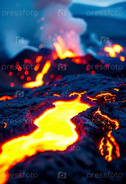 Лава течет вниз по вулкану, светясь на темной земле, а извержения выбрасывают облака пепла в сумеречное небо, создавая потрясающее природное зрелище. Генеративный искусственный интеллект