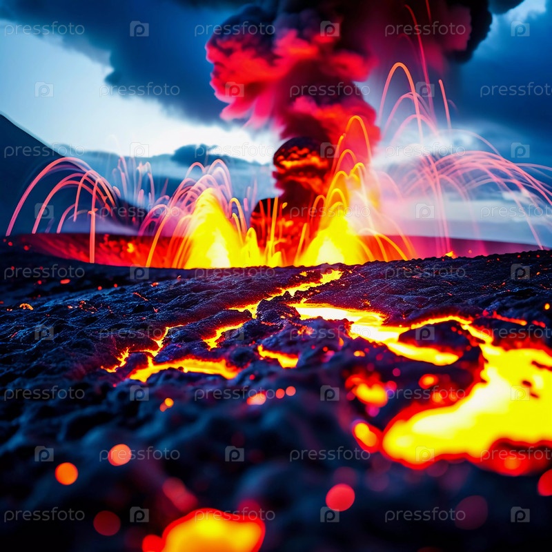 Магма вырывается наружу сверкающими дугами, когда яркие потоки лавы хлещут из кратера, освещая темный ландшафт огненными оттенками во время драматического извержения вулкана. Генеративный ИИ