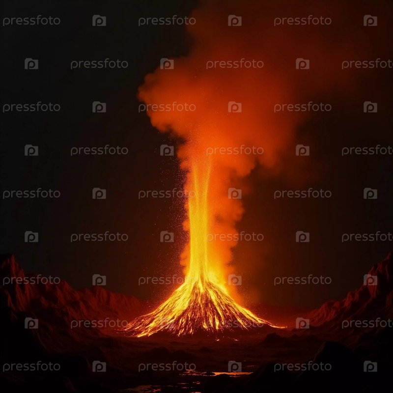 Ночью вулкан бурно извергается, выбрасывая высоко в воздух расплавленную магму, сопровождаемую густыми шлейфами пепла, которые освещают пересеченную местность. Природа демонстрирует свою свирепую красоту