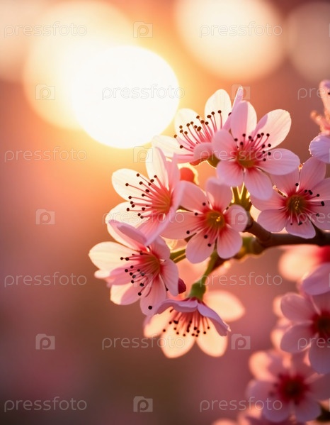 В нежных объятиях солнечного весеннего утра нежные цветки вишни раскрывают свои лепестки, купаясь в теплом сиянии рассвета. Мягкие розовые оттенки прекрасно контрастируют с золотым солнцем, восходящим на заднем плане, создавая волшебную атмосферу. Пчелы л