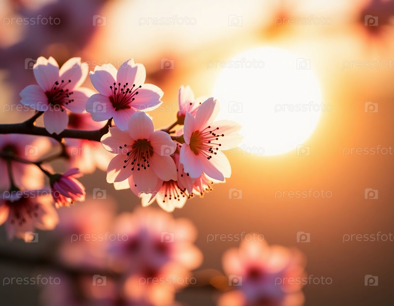 Нежные вишневые цветы украшают ветви, их нежно-розовые лепестки освещены нежными лучами яркого утреннего солнца. С пробуждением весны пейзаж излучает тепло и свежесть, приглашая радостные моменты и безмятежные размышления. Гармоничное сочетание цветов рис