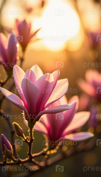 Нежные цветы магнолии, их нежно-розовые лепестки, сияющие в утреннем солнце, пробуждают сад яркими оттенками. Купаясь в золотом свете, каждый цветок, кажется, танцует от радости, когда начинается день. AI